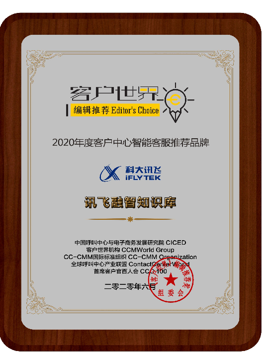 科大讯飞(讯飞融智知识库)入选《客户世界》编辑推荐:2020年度智能客服推荐品牌榜。
