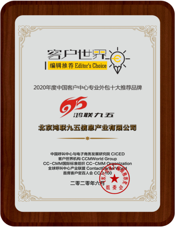 鸿联九五荣膺《客户世界》编辑推荐 “2020年度中国客户中心专业外包十大推荐品牌”奖。