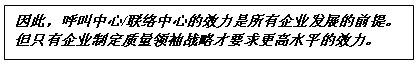 坦率的说,不是所有的呼叫中心都必须要求是高效的。有效性的等级可由企业竞争性战略来定位。有些企业制定了“质量领袖”战略。这些企业设置的质量等级超越竞争对手。Rolls-Royce就是最好的实例。Rolls-Royce所要求的质量等级远远高于Nissan(至少在Rolls-Royce和他们的客户的眼中是这样的看法)。质量领袖战略无法改变的是高成本,但也成为引领庞大市场的领袖,因为对于竞争对手而言,大幅度提升质量比大幅度降低成本更有难度。为了保持质量领袖战略,Rolls Royce的呼叫中心的效率必须远远高于Nissan的呼叫中心。
