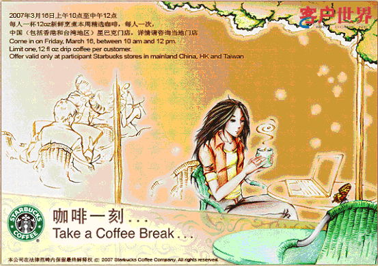 “2007年3月16日上午10点至中午12点,每人一杯新鲜烹煮本周精选咖啡。”——中国星巴克门店