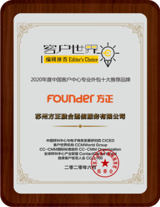 方正融合通信荣膺《客户世界》编辑推荐 “2020年度中国客户中心专业外包十大推荐品牌”奖