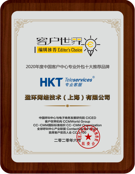 转载请注明来源:HKT Teleservices荣获《客户世界》编辑推荐 “2020年度中国客户中心专业外包十大推荐品牌”殊荣