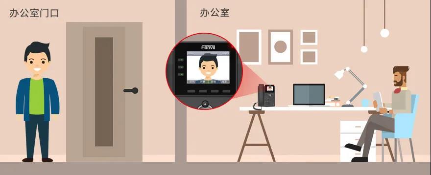 企业办公方案:方位X3V支持硬件视频解码(H.264,1080P),可搭配主流IP摄像头和方位视频门禁终端一起使用,适用于企业办公,用户可通过话机进行视频预览、通话及远程开门。
