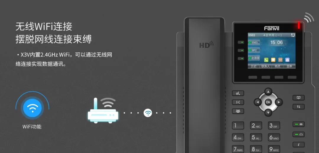 方位X3V内置2.4GHz WiFi,无需网线即可联网,有助于减少办公室的布线,还原办公桌的整洁,让您畅快地享受无线办公环境下的顺畅沟通。除此之外还支持外接EHS耳机,让您在接通电话的同时能够处理其他事务,大大提高工作效率,适合各种办公场景。