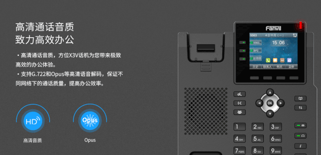方位X3V支持高清语音解码G.722和Opus,保证不同网络下的通话质量,为您提供优质、清晰的语音通话体验。