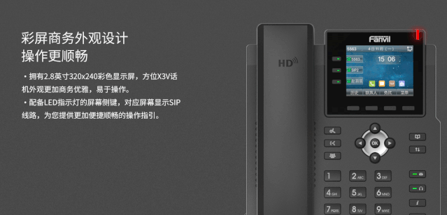 方位X3V拥有2.8英寸320*240分辨率高清彩色显示屏,给您更理想的视觉体验。配备LED指示灯的屏幕侧键,对应屏幕显示SIP线路,操作更加便捷顺畅。