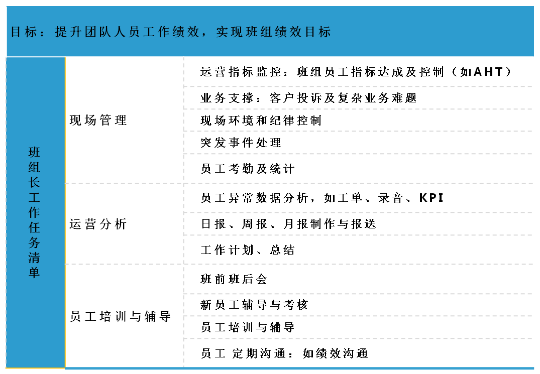 班组长日常主要在做三件事,现场管理、运营分析和员工培训与辅导。