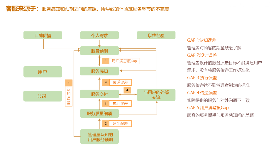 结合服务设计的GAP图(图3)来看,之所以称为服务设计,是因为所有的产品和服务其实都是从认知中来,到客户中去。从企业的设计认知到客户的体验,我们要经历设计、执行、传递,直到用户的期望满足。在整个过程当中有五个GAP,这五个GAP的满足其实是服务设计的关键,也是客服设计的关键。如果把它看成宏观的整体产品设计,那么客服这个行业来源于这五个GAP永恒的存在。所以,永远需要去倾听客户的声音,理解客服所接收到的问题,从而知道自己的设计误差、执行误差、传递误差,以及设计和客户体验之间的误差到底有多大。