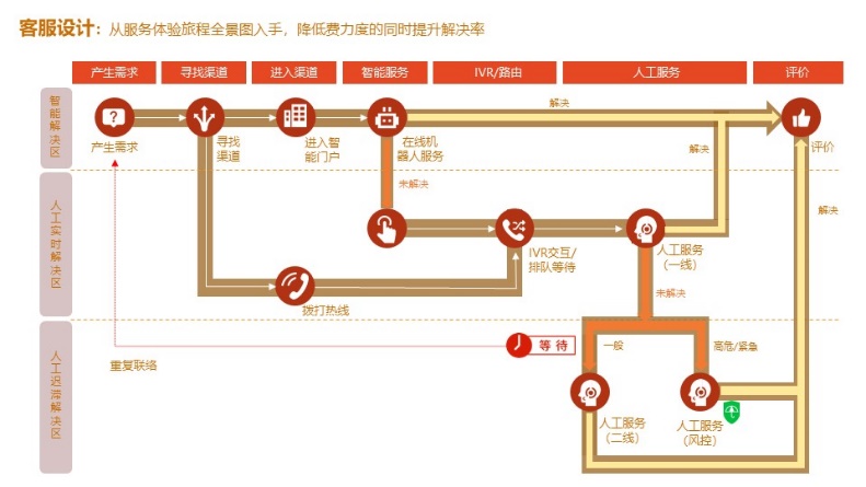 在整个服务设计过程当中(图4),客服其实也不是只有人工客服这一条线路。它是从服务入口开始的,你要寻找渠道、进入到渠道。让用户能够在需要你的时候瞬间找到你,本身是服务者设计的关键,然后才是能不能够智能解决。不用问用户开不开心、满不满意、高不高兴,而是要看他的脚是离开你并且回归到了正常渠道,还是点击了转人工或者放弃你。如图4,就是客户服务旅程的设计样例,在这个旅程图中,服务设计者要追求整体的服务费力度最低,其中既包括了每个环节的服务费力度,也包括了整体的服务费力度最低。