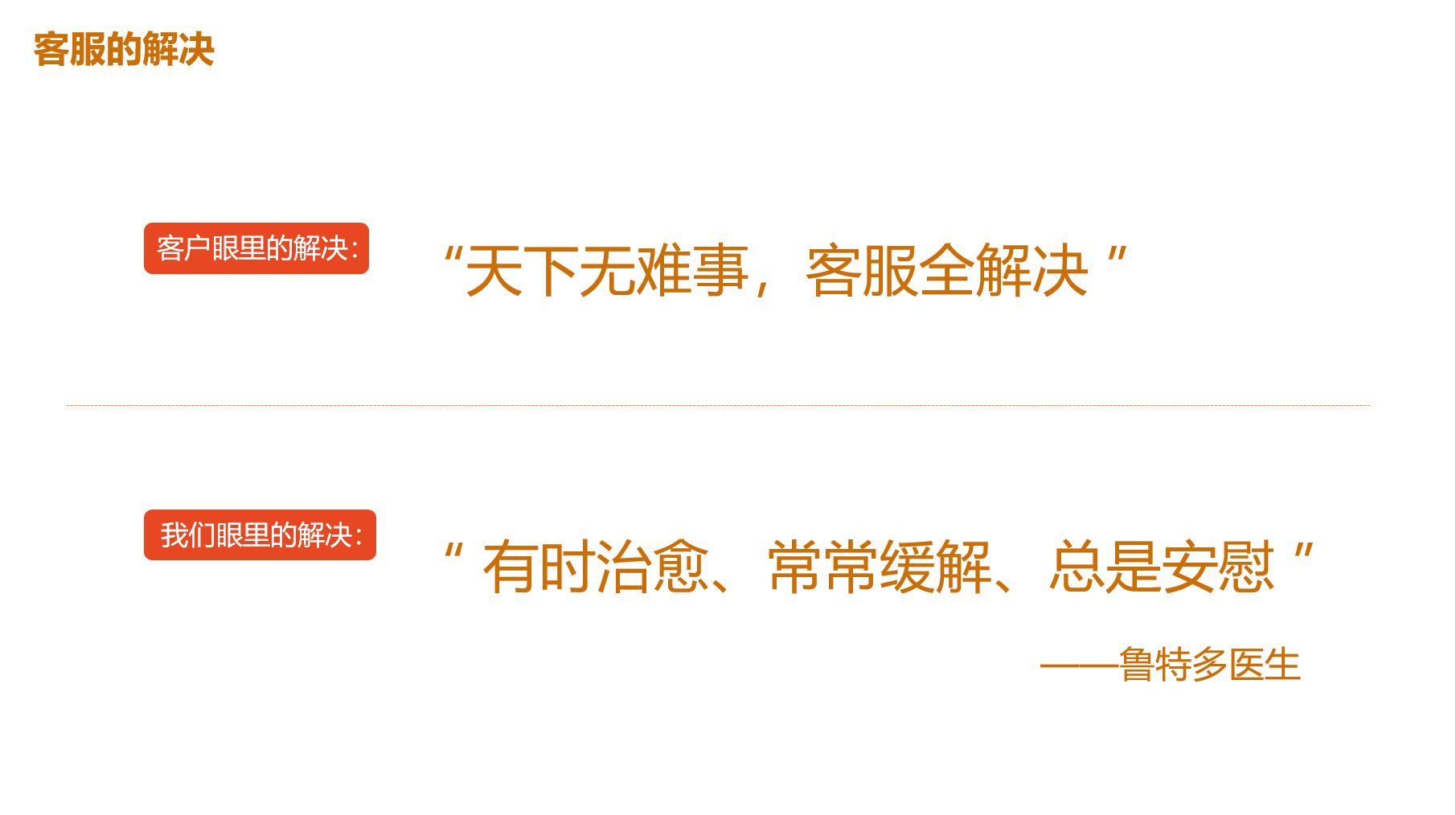 在用户的心目中,遇事不要慌,万事找客服,客服什么都能够解决。但事实上通过这么多年的服务经验,我很客观的评价客服和医生差不多。鲁特多医生有个著名的三段论(图5):“偶尔能够治愈,时常能够缓解,总是能够抚慰“。这句话套到服务行业里其实也是一样。少部分的问题是能够真正解决的。真实的解决对于用户来说是如果到店无房,你能有房,今天送餐超时,你能准时送餐,这才叫绝对意义上的解决。但是由于这种场景本身占比不高,加上复杂的环境变化,我们并不能100%做到解决。但是由于我们有流程、规范和套路解法,我们时常可以让事情变得比原来更好一点。比如餐可以更快一点,或者在等餐的时候你的心情能够更好一点。总是有抚慰,我的专业和我的存在使得你只要进来,不管你拿走的答案是什么,你会发现这是一次有温度的交互,这就是我心目当中客服能够解决问题的思路。