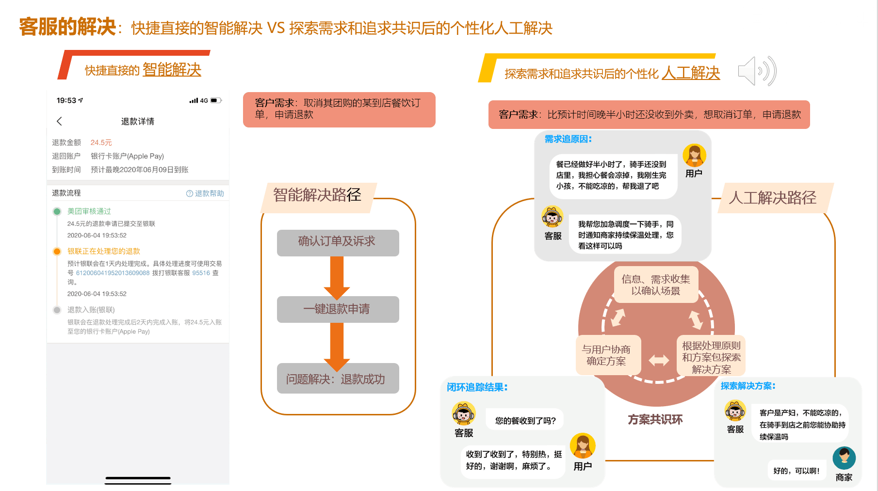 举个例子,一个哺乳期的妈妈下了一单外卖,但是没有骑手接单,于是找到了客服。她的诉求表达出来是我要退款,但是通过我们的客服挖掘原因之后,会发现她是因为不能吃凉的,所以这位客服主动跟商家协商能不能持续加热做好保温,得到商家认可之后他再持续跟进这张订单,直到骑手配送完毕。我们如果用一个线性的流程,他的解决方案其实是退款,因为到现在为止还没有骑手接单。但是当他用探索式有温度的流程的时候,才有可能探索到真正的诉求,并且寻求到这个中间最稳妥的解决方案,从而能够给用户传递到有温度的解决方案,这个其实就是所谓的解决。