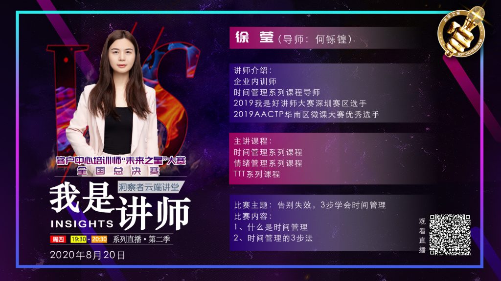 【我是讲师(第2季)】的主题是:为培训师加油;同时也是2020第二届客户中心培训师“未来之星”大赛-全国总决赛的比赛环节。直播课堂将采用师徒制的方式,在辅导老师的全面指导下,通过自选主题/一小时直播和互动答疑的方式,展示培训师全面的能力和个人风采。8月20日19:30-20:30,总决赛第一位选手是:来自深圳赛区的徐莹;她将率先出场,先声夺人;辅导老师是上届冠军:何铄锽。