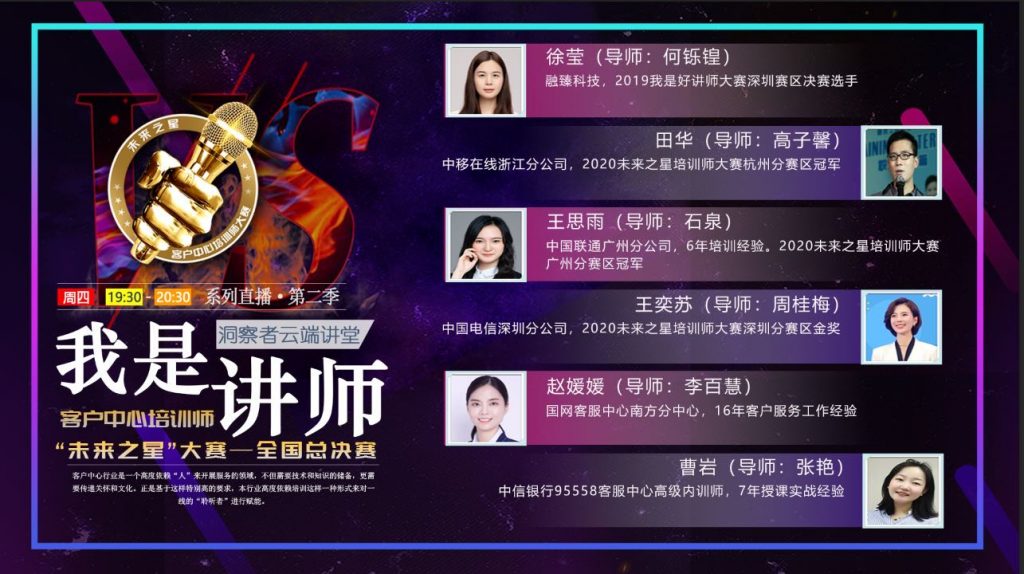 【我是讲师(第2季)】的主题是:为培训师加油;同时也是2020第二届客户中心培训师“未来之星”大赛-全国总决赛的比赛环节。直播课堂将采用师徒制的方式,在辅导老师的全面指导下,通过自选主题/一小时直播和互动答疑的方式,展示培训师全面的能力和个人风采。