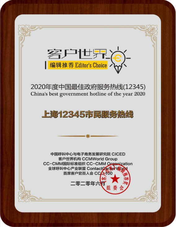 上海12345市民服务热线荣获《客户世界》编辑推荐:2020年度中国最佳政府服务热线(12345)