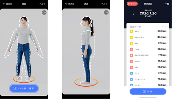 “Bodygram”是一项采用人工智能(AI)的学习功能来测量人体数据的先进技术。用户在输入年龄、身高、体重和性别之后,可以用智能手机在穿衣状态下拍摄正面和侧面两张照片,系统能自动检测被拍摄者的身体曲线,推算出腰围、肩宽、手足长度等全身各部位数据,误差在±1cm。