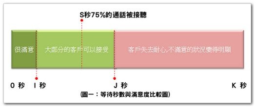 另外;S秒的值是如何被制定的呢?下图代表一个业务服务的等待时长与客户满意度的关系,S为目前设定的服务水平目标接听秒数,75%的电话都在这个秒数内被接听,每个不同的业务服务都存在一个J秒的点,介于客户满意与不满意的临界点,在J秒之后客户开始失去耐心,若能够有效地分析各个业务服务在不同接听秒数的客户满意度,并尝试缩短S与J的距离,则踏出人资优化的成功的第一步,因为这个S秒数,可是左右着服务水平百分比的生杀大权,举例来说;16秒时75%,20秒时可能达到95%,如果订得好,客户满意度不会有太大的影响,但服务水平的解读可能大大不同,这也意味着人力是有机会可以被更佳的运用。