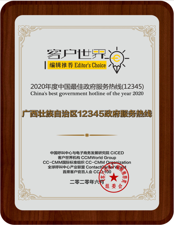 广西壮族自治区12345政府服务热线荣获《客户世界》编辑推荐:2020年度中国最佳政府服务热线(12345)