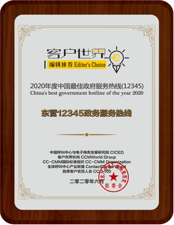转载请注明来源:东营12345政务服务热线荣获《客户世界》编辑推荐:2020年度中国最佳政府服务热线(12345)