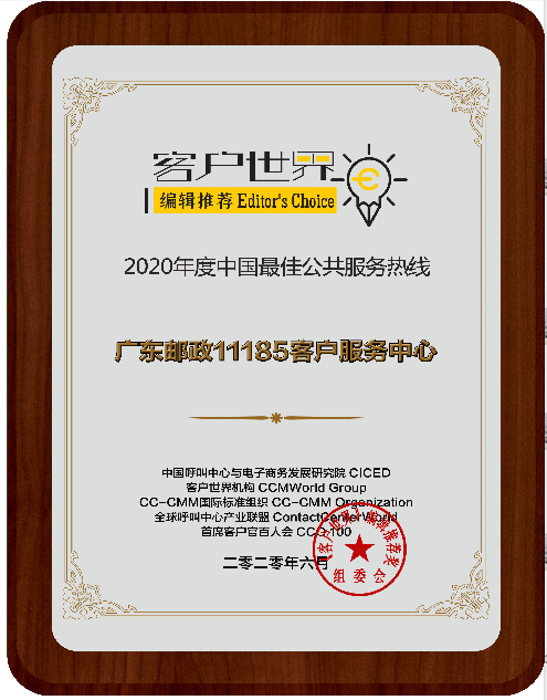 转载请注明来源:广东邮政11185客户服务中心荣获《客户世界》编辑推荐:2020年度中国最佳公共服务热线