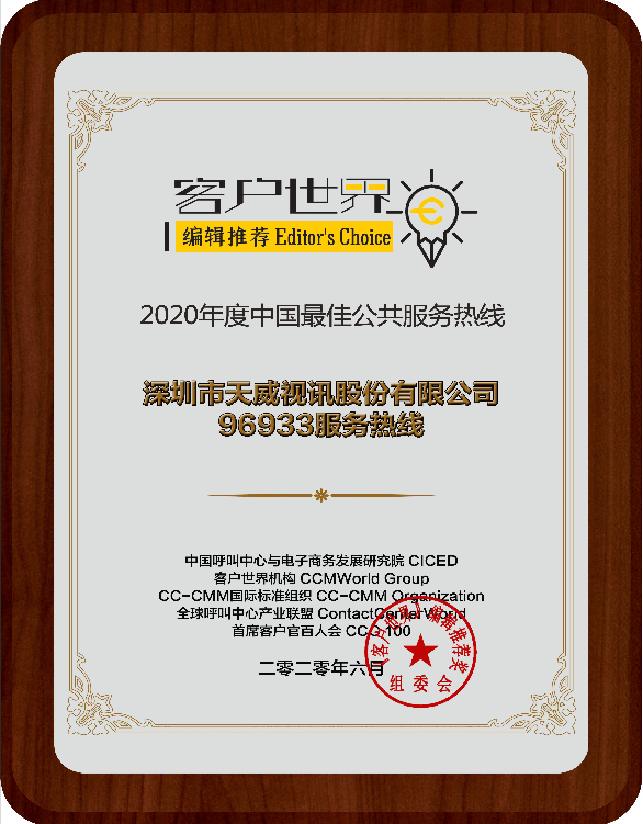 转载请注明来源:天威视讯96933荣获《客户世界》编辑推荐:2020年度中国最佳公共服务热线