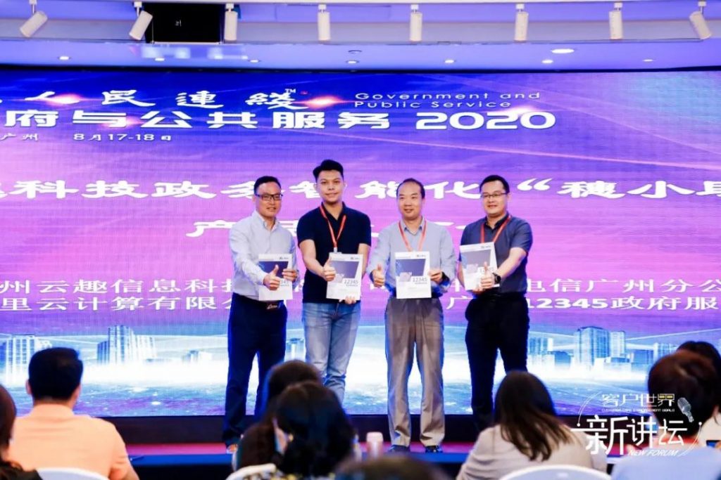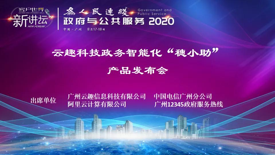 2020年8月18日,广州。客户世界消息:客户世界 • 新讲坛:政府与公共服务2020在广州阳光酒店成功举办,会上发布了云趣科技政务智能化“穗小助”产品发布会,此次产品发布会是客户世界•新讲坛:政府与公共服务2020的重要环节之一,由广州云趣科技、中国电信、 阿里云、广州12345政府服务热线共同出席,发布并展示了由云趣科技研发打造的政务热线行业首款AI产品——广州12345政府热线座席助手“穗小助”。
