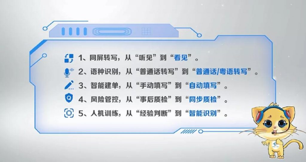 通过同屏转写、语种识别(普通话识别准确率达到90%,粤语识别准确率达到75%以上)、智能建单、风险管控、人机训练为话务员提供实时业务指导及监控管理,打破了广州12345热线原有的传统接听格局。