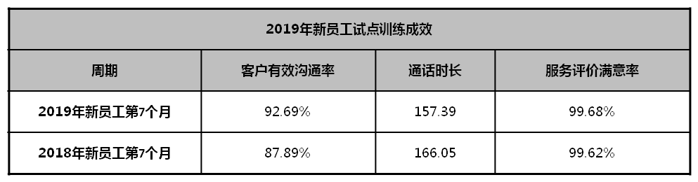 为巩固、深化员工“四维双重”沟通能力训练模型应用效果,建立员工优质服务习惯养成,我们将该训练模型在100名新员工群体中开展了试点应用。经过为期6个月两阶段的沟通能力训练,试点新员工“客户有效沟通率”上升4.8个百分点,“平均通话时长”缩短8.66秒,“服务评价满意率”上升0.06个百分点,改善初见成效。