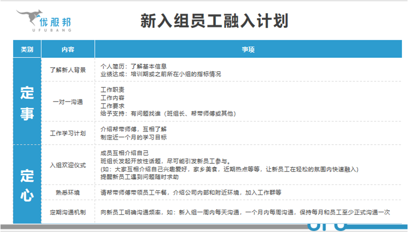 (一)提前了解新人背景,第一时间和员工一对一沟通,根据新人的情况,明确工作职责、内容和要求,并给予工作上的支持。