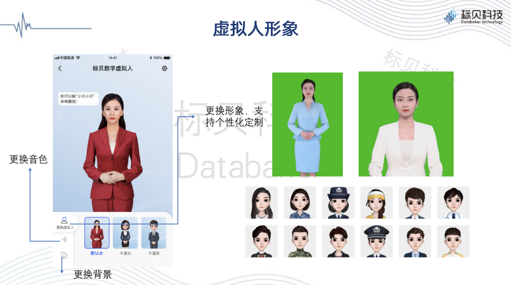 结合人工智能系列技术,标贝科技 AI 虚拟数字人能够实现流畅的人机对话,并支持语音交互、图文解说、对话问答、金融双录服务等功能,为用户呈现具有智能感知、人性化的虚拟数字人服务。