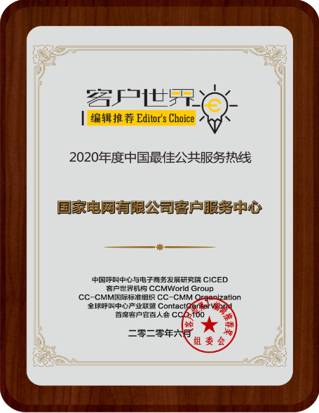转载请注明来源:国家电网有限公司客户服务中心荣获《客户世界》编辑推荐:2020年度中国最佳公共服务热线