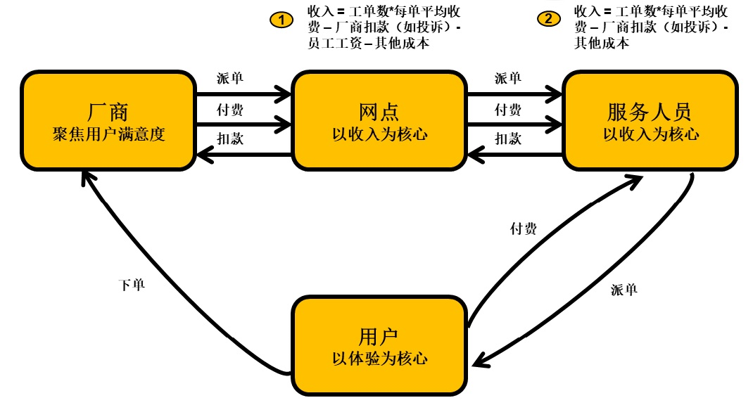 如图1所示,真正问题出在了网点和服务人员的盈利模式上。很多厂商的服务网点采用的是外包形式。网点和服务人员的诉求是收入,但厂商和用户的诉求是体验和满意度。我们下面仔细分析,你就会发现网点和服务人员收入的诉求与用户体验和满意度是有很大冲突的。