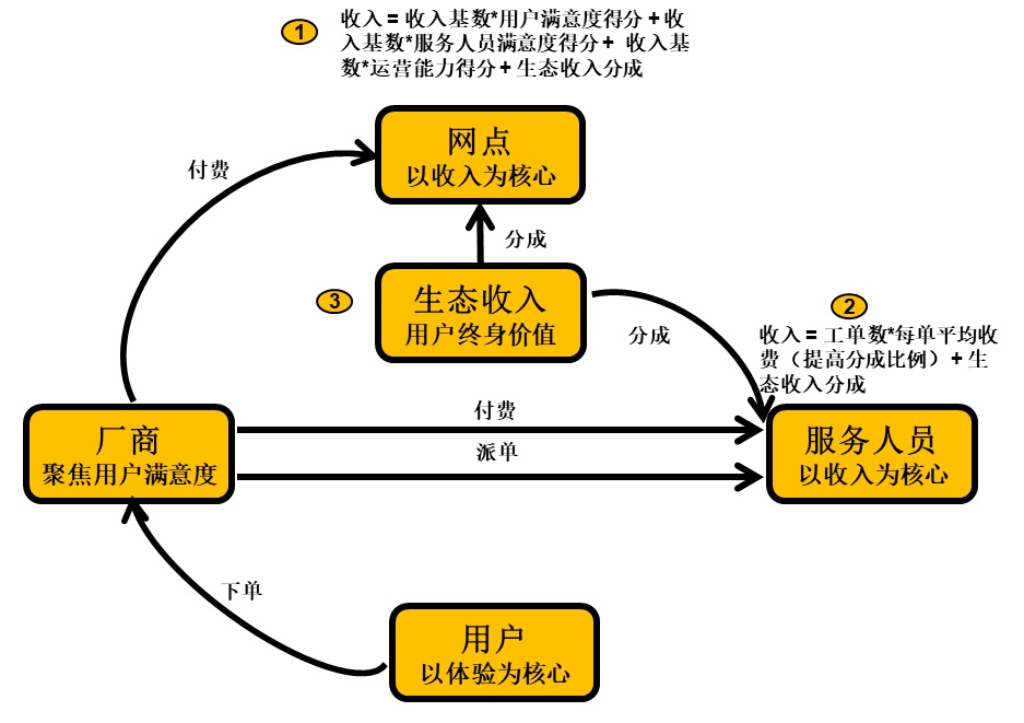 1、网点平台化:网点需要重新定位,我们可以整合某一地区若干网点,形成地区运营中心,由原来仅仅以服务收费为主,到运营整个地区的服务支撑体系(如备件、库房、车辆等),用户满意度,服务人员满意度,生态体系,活动策划和运营等为主。收入也不再以工单量为衡量,而是根据运营效果,用户满意度,服务人员满意度和生态收入等综合评定。