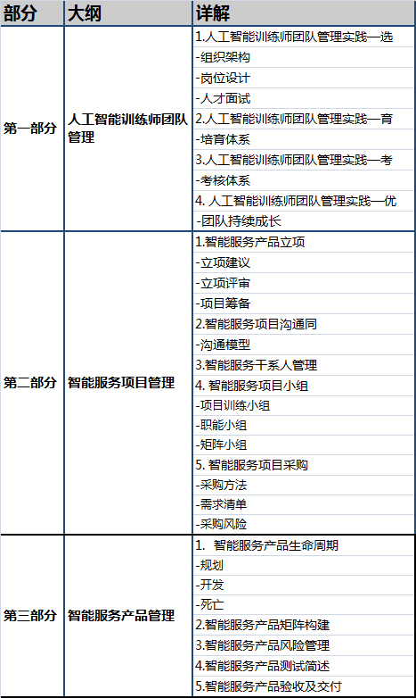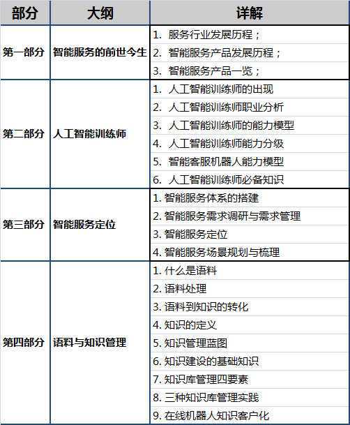课程对象:智能产品训练体系搭建完成,从整体智能服务产品、项目角度进行智能服务规划,训练师团队架构体系调整,人员能力持续培养优化或参加过中级课程。