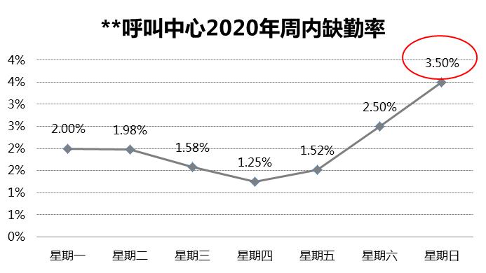 员工可能会需要在节假日出席亲朋好友安排的聚会,事实上节假日恰恰也是很多呼叫中心的话务高峰,需求人力到达高峰,自然也就无法安排员工在此期间休班,事假发生在节假日的几率应该会更高。因此我们猜想,每逢周末、节假日是不是缺勤率就会相对工作日出现对应的上涨趋势呢?