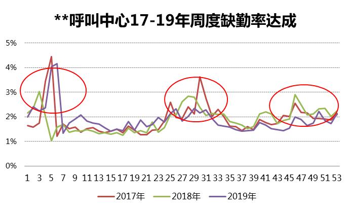 图2:某呼叫中心2017-2019年周度缺勤率统计