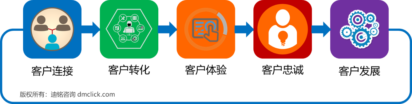 如图1所示,客户管理框架包括了客户连接、客户转化、客户体验、客户忠诚、客户发展的客户全生命周期管理过程。这一管理框架也被中国客户管理产业创新联盟引用作为描述客户管理的基本框架[2]。