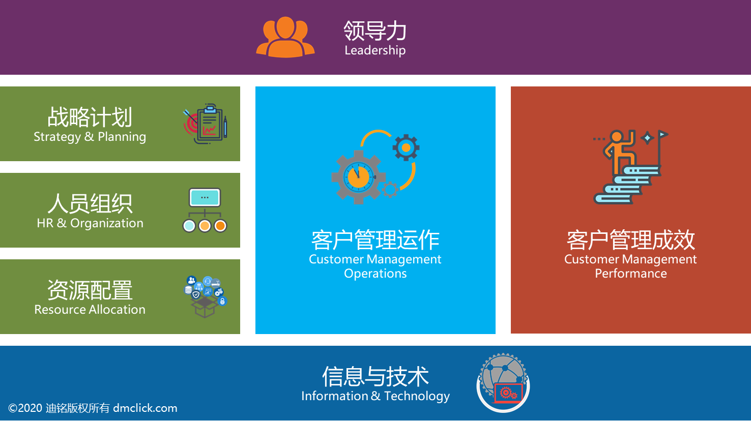 具体来说,客户管理能力模型的要素包括了领导力、战略计划、人员组织、资源配置、信息与技术、客户管理运作与客户管理成效。