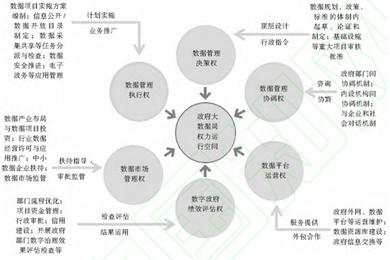 从机构命名来看,“大数据发展管理局”“数据资源管理局”“大数据与政府服务管理局”等不仅蕴含了政府部门要对大数据资源进行统筹管理的目标,也预示着对政府数据资源开发的高度重视。与单一化、部门化的政府数据管理相比,尽管均需履行数据管理职能,但前者将数据视为政府资产与神经中枢,遵循着开放、共享、价值、协同的数据思维,追求数据驱动型决策与数字化公共服务,兼顾了市场和社会对数据产品的价值需求;而传统数据管理体制,局限在数据的工具理性层面,注重的是数据收集、加工、存储等环节的专业化管理,专注于数据开放、跨部门数据共享等格式、标准、质量……微观问题的具体解决方案,缺乏复杂环境下政府数据开发利用的全局性考量,数据管理与行政工作的结合有限。