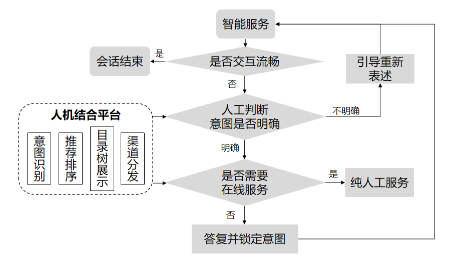 这个功能体现在用户侧,就是用户在智能在线客服交互过程中,出现识别意图失败、用户表示不满情绪、不确定意图多次推送模糊推荐、交互次数过多、答复相同答案多次等交互不通畅的情况,则立即接入人机结合平台,并请用户等待人工回复结果(见图2)