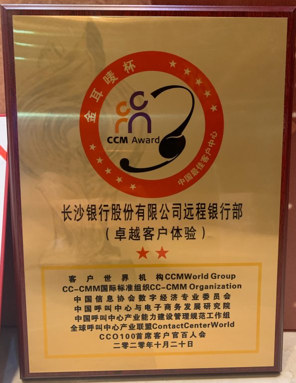 长沙银行股份有限公司远程银行部在本年度的“金耳唛杯”中国最佳客户中心评选中获得:卓越客户体验奖。