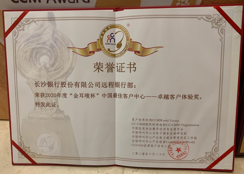 转载请注明来源:长沙银行股份有限公司远程银行部荣获2020“金耳唛杯”中国最佳客户中心卓越客户体验奖