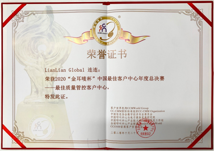 LianLian Global荣获2020第十六届“金耳唛杯”中国最佳客户中心——“最佳质量管控客户中心”荣誉称号