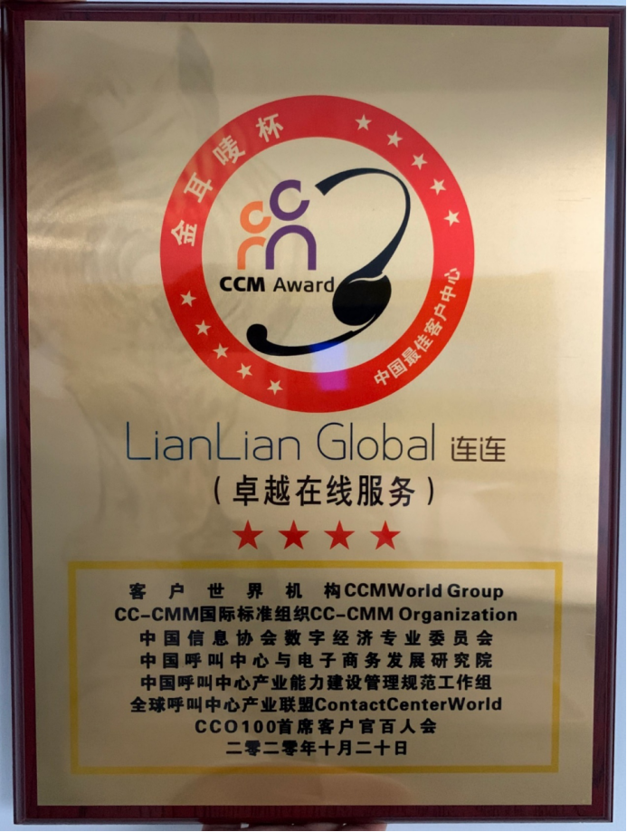 同时在本次评选中, LianLian Global还荣获2020年度“金耳唛杯”中国最佳客户中心——【卓越在线服务】奖项,这也是连连第4次获得该荣誉。