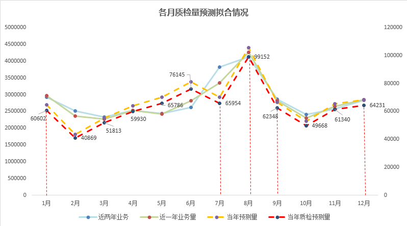 质检量受业务量波动影响较大,尤其是质检比例较高的类业务,因此需根据往年业务量以及当年业务量变化情况,建立各类型业务量的预测模型(图3),根据预测结果动态调整常态质检比例,保证既满足上级部门质检量要求,同时兼顾质检员工作能力和质量管控效果。