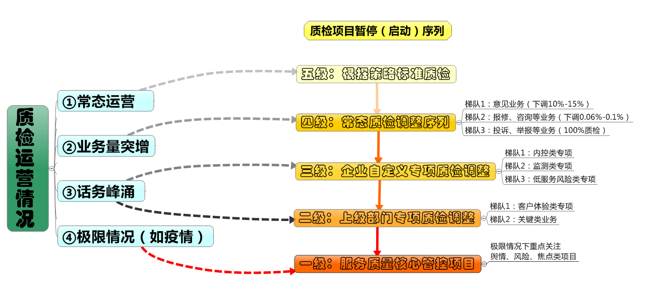 如呼叫中心典型话务高峰期时,为保证客户体验感知良好时,保证接听率时,质检人员需签入应急接听电话时,可根据自定义和上级部门专项优先级启动暂停梯队;在重点指标电话服务满意率发生异常时,则质检策略需调整;对临时性用工受理的业务工单加大质检力度,设定被检数最低阀值。