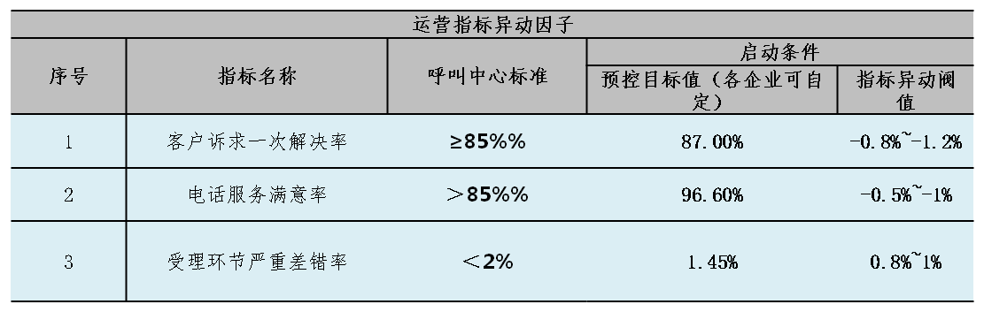 为进一步推进质检工作与现场运营的协同性,结合需重点跟踪的6项重点指标,设定运营指标异动因子(表1),该因子的启动条件由月度预控目标值和月度指标异动阀值两项构成,根据当月实际指标完成情况,一旦超过任意一项异动因子管控阀值,则自动触发质检策略调整机制,增加相应的监控质检项目。