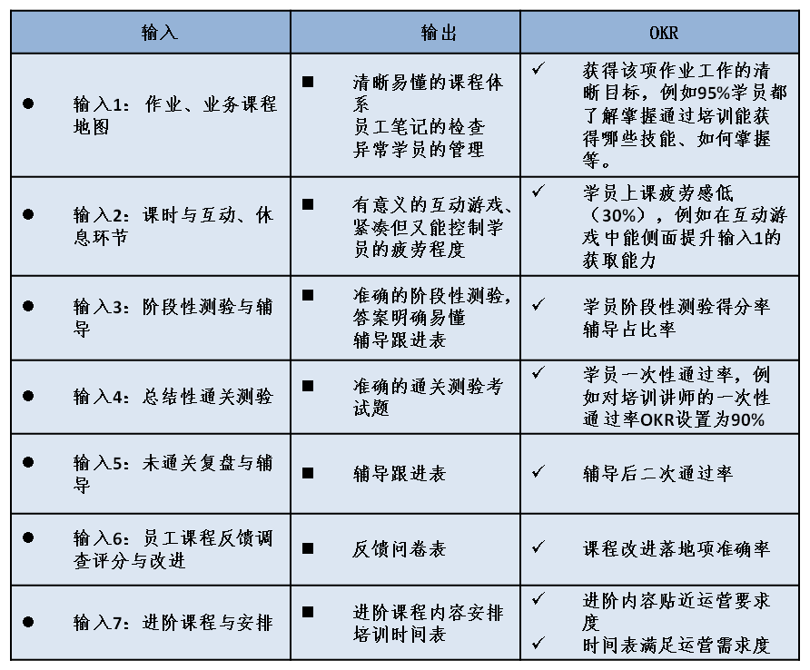 管道式成长素质要求培训体系需要按照此来继续WBS分解工作包,安排相应的培训课程协助员工成长。这里值得注意的是,此培训应采用内部管理者开发课程与采购外部专业培训同时开展,一是能够满足员工心理需求(获得外部培训机会),二是管理团队获得更多行业培训标准也,反向帮助各级管理团队自我成长。同理,也应参照培训结果输入输出表设置对应的考核培训OKR。