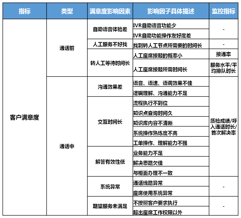 对于满意度来讲,一次服务的交互再到客户最后的选择,中间有多个环节会影响到最终评定,那么从客户接触点出发分析不满意可能产生的原因,并且归类到不同运营指标,进而分析不同指标的关联程度对于实现运营最优解非常重要(表1)。