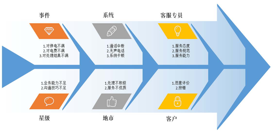 为了提升员工服务评价满意率,某客服中心抽检2020年1-4月客户评价不满意的工单885条,通过复核录音的方式进行关键问题梳理,发现客户不满意的主要原因体现在“人”(客服专员人员责任)、“机”(系统问题)、“料”(事件本身)、“法”(星级技能) “环”(1.服务的省市、2.服务的客户)五个方面共计6个因素,具体如图1所示。