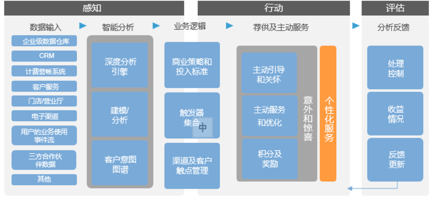 基于行动后用户级数据的持续获取,对所执行的服务和行动做出评估和持续改进。随着外部环境变化(竞争环境变化、大型节假日和大规模公众事件等),内部工作进展(5G网络建设、新产品和业务上线等)的情况下,也需要进行持续的学习和迭代更新,以维持并改进面向客户的个性化服务的准确性和效率。